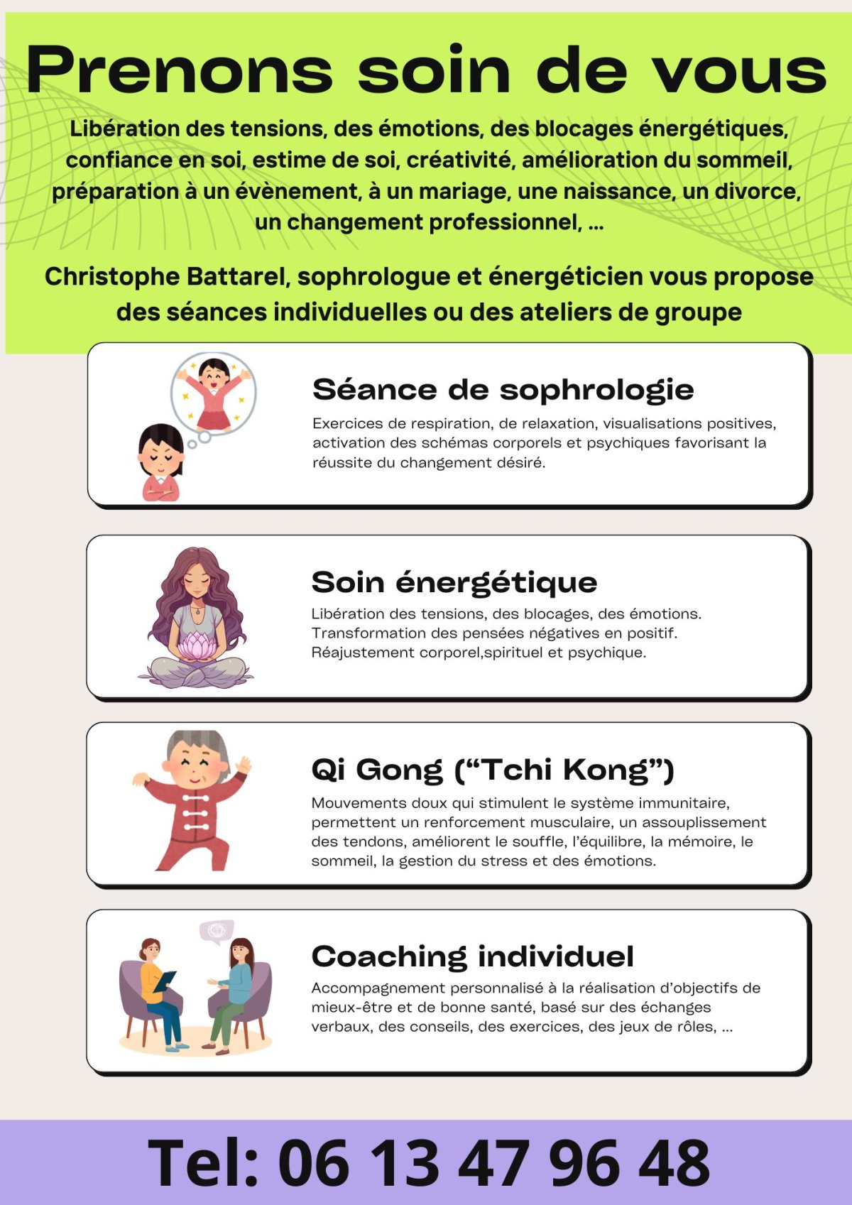 Exercices de respiration, de relaxation, visualisations positives, activation des schémas corporels et psychiques favorisant la réussite du changement désiré.